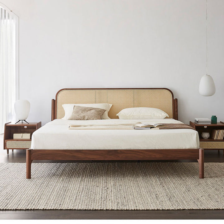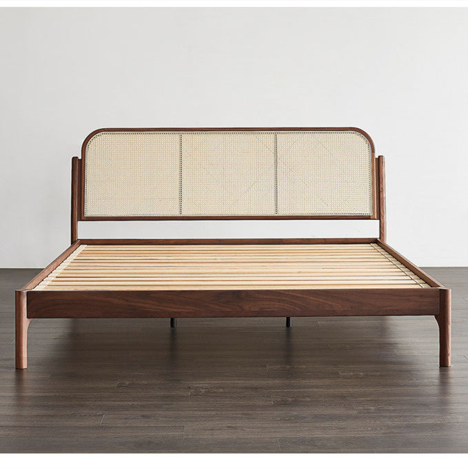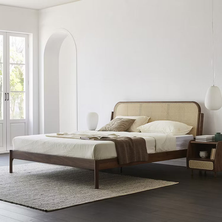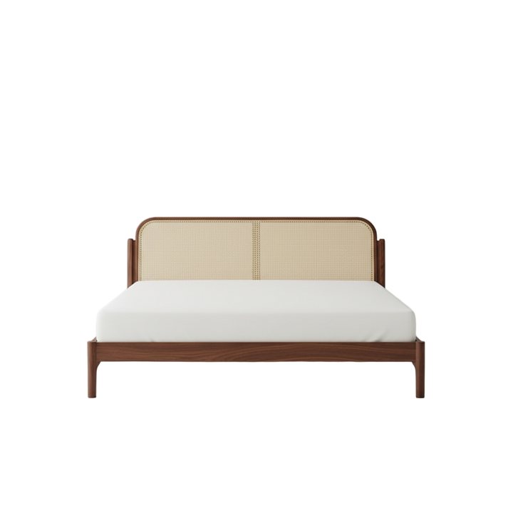 Mid-Century Modern Rattan Panel Bed – Solid Wood Frame with Curved Headboard