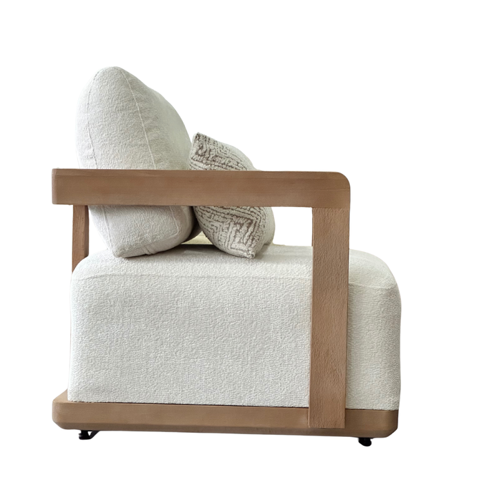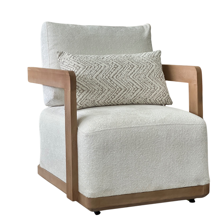 Bring sophisticated comfort and natural warmth into your home with this stunning Modern Rustic Accent Chair. Its clean lines and generously proportioned cushions create an inviting, supportive silhouette. The exposed frame features a solid wood structure with a warm, rustic finish, providing a beautiful contrast to the plush, light-toned upholstery. Wrapped in a durable yet soft premium chenille fabric, the chair offers a delightful texture and exceptional, soft seating thanks to its high-density foam core. Complete with a stylish decorative pillow featuring a geometric weave, this chair is the perfect statement piece for living rooms, sunrooms, or cozy reading areas.