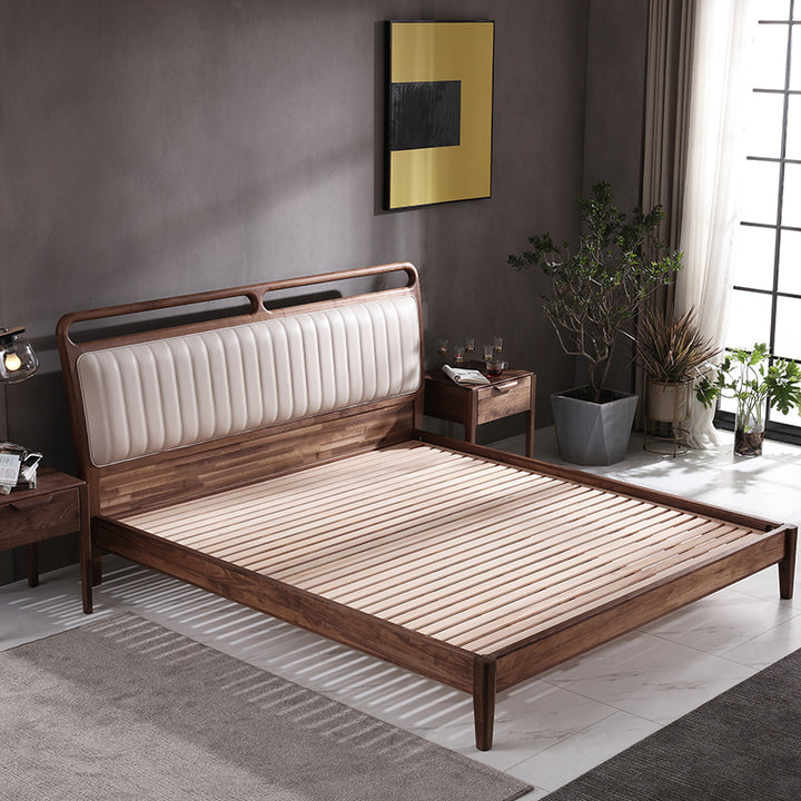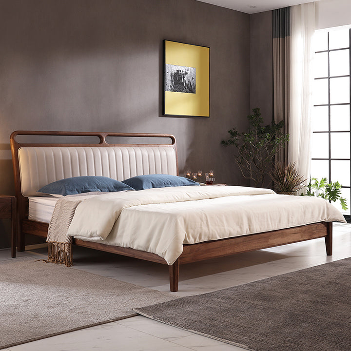 Mid-Century Modern Bed – Sculpted Wood Frame with Vertical Channel Upholstered Headboard