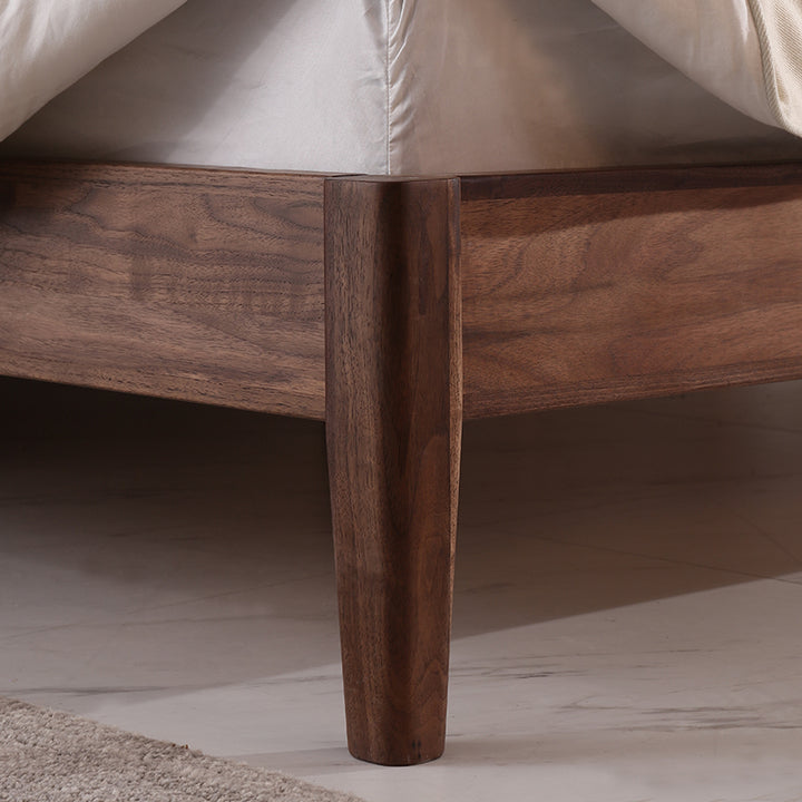 Elevate your bedroom with this Mid-Century Modern Bed, featuring a beautifully sculpted solid wood frame and a striking upholstered headboard. The headboard is designed with vertical channel tufting in a soft, neutral fabric, framed by a rounded walnut wood border with unique cut-out detailing along the top. This combination of rich wood grain and plush upholstery creates a look that is both timeless and inviting. The platform base and tapered legs offer sturdy support and classic mid-century appeal, while the minimalist silhouette ensures versatility for modern, Scandinavian, or transitional interiors. Perfect for those seeking a blend of comfort, durability, and iconic design.