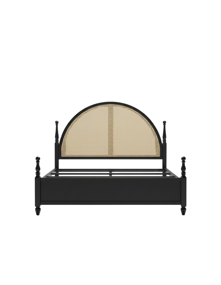 Modern Black Rattan Platform Bed – Semi-Circle Woven Headboard & Low Profile Frame