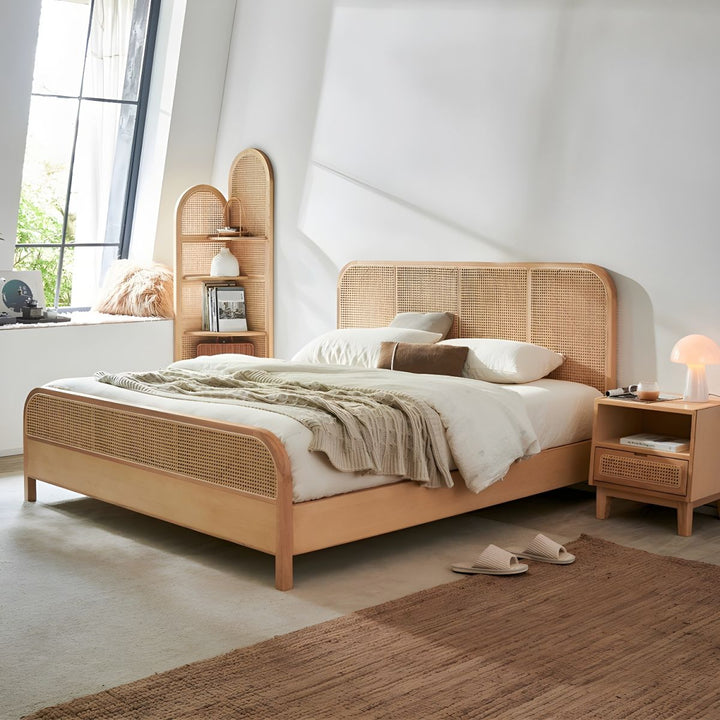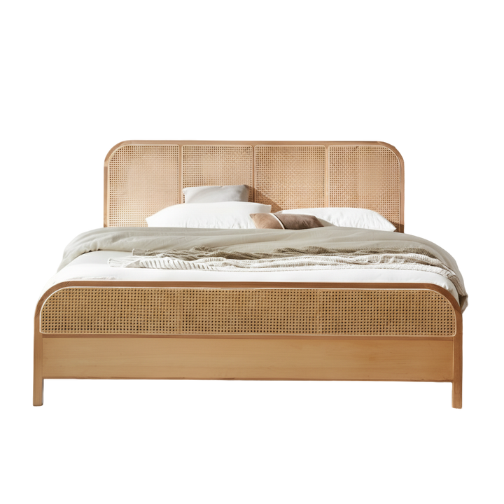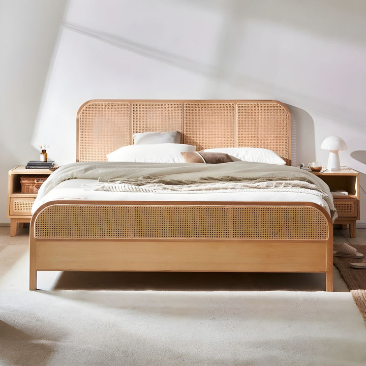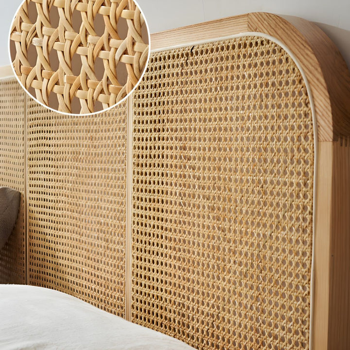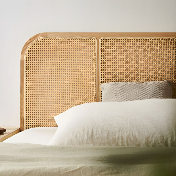 Paneles de ratán tejidos a mano tanto en la cabecera como en el pie de cama para una textura orgánica y transpirabilidad.