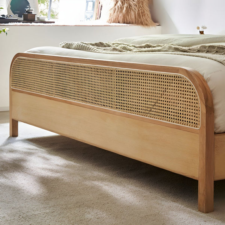 Cama moderna con paneles de ratán: estructura de madera maciza con cabecero y pie de cama curvos