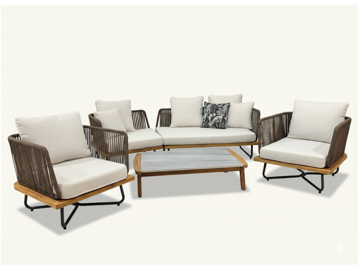 Transforme su patio con este conjunto contemporáneo de sofás para exteriores de madera maciza de teca y aluminio de primera calidad, diseñado para el clima de la Ciudad de Panamá. Con un espacioso sofá de tres plazas, dos sillones y una mesa de centro a juego, este conjunto combina comodidad, durabilidad y estilo para cualquier espacio al aire libre.