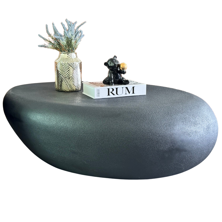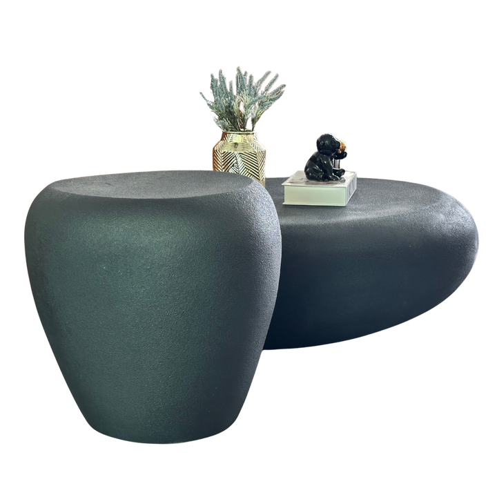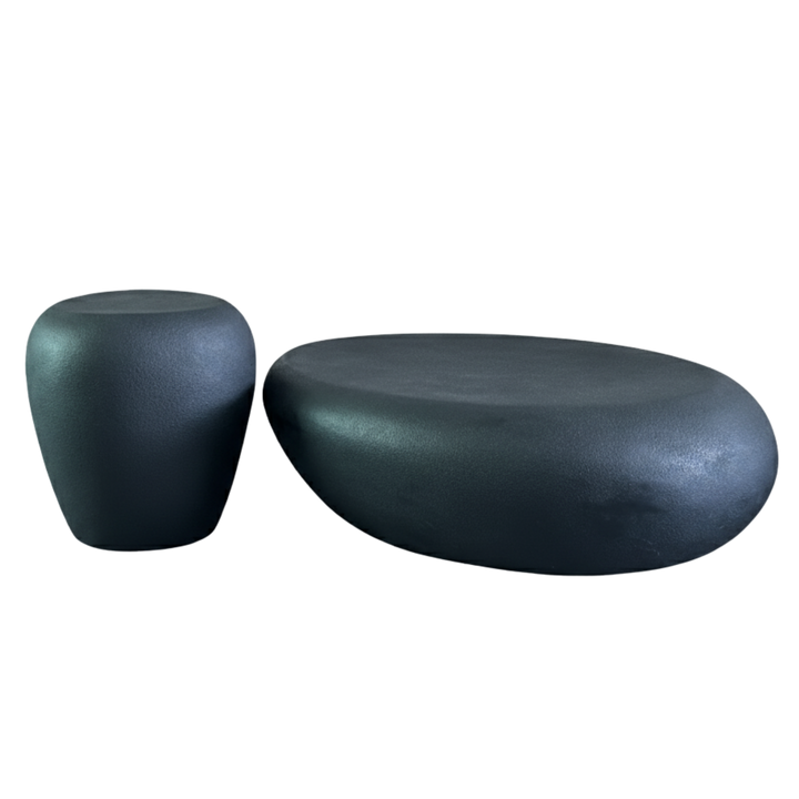 Realza tu espacio vital con este juego de mesa de centro y auxiliar inspirado en la piedra, diseñado para traer la esencia relajante de la naturaleza a tu hogar. Elaboradas con formas suaves que imitan las piedras y un acabado mate en carbón, estas mesas crean un punto focal impactante a la vez que ofrecen superficies prácticas para el día a día.