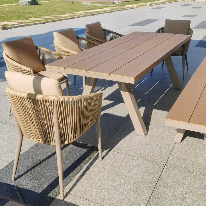 Realce su espacio exterior o comercial con este moderno sillón de cuerda para exteriores, diseñado por expertos para ofrecer estilo y durabilidad. Con una robusta estructura de aluminio con recubrimiento en polvo de calidad comercial y elegantes detalles de cuerda tejida a mano, este sillón combina un diseño contemporáneo con una resistencia excepcional. Sus suaves cojines resistentes a la intemperie brindan una comodidad superior, lo que lo hace ideal para patios, jardines, locales de hostelería y elegantes residencias. Diseñado para un uso intensivo y de fácil mantenimiento, este sillón es la opción perfecta para un sofisticado asiento exterior.