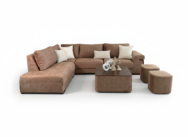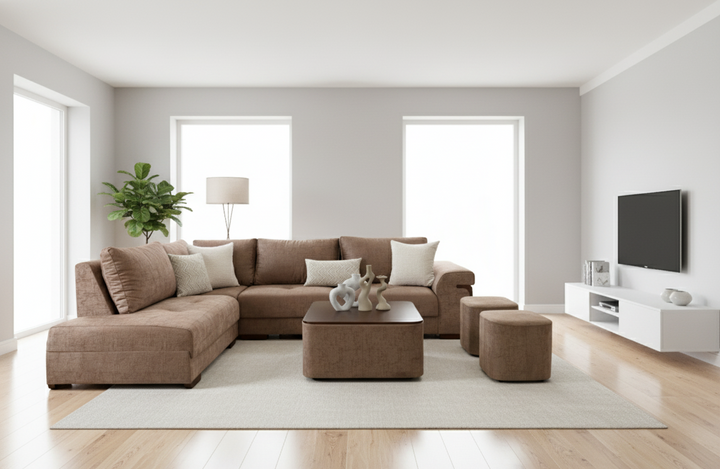 Transforma tu sala de estar con este moderno juego de sofás seccionales color crema, con una lujosa tapicería color crema y un espacioso diseño en forma de L, perfecto para hogares contemporáneos. El juego incluye una mesa de centro rectangular a juego y dos versátiles taburetes otomanos. Ofrece asientos versátiles y un estilo funcional. Los profundos cojines del asiento y los amplios cojines del respaldo brindan una comodidad excepcional, mientras que las líneas limpias y los sutiles detalles en madera del sofá le aportan un toque de sofisticación. Ideal para reuniones familiares, recibir invitados o relajarse con estilo, este juego seccional es una pieza central destacada en cualquier espacio moderno.