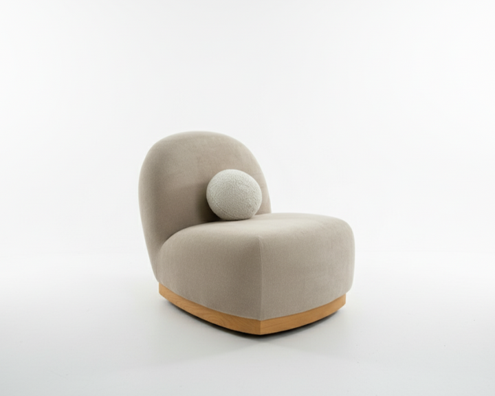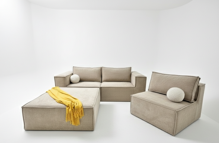 Conjunto de sala de estar minimalista moderno en color crema: sofá modular seccional, otomana y sillón curvo