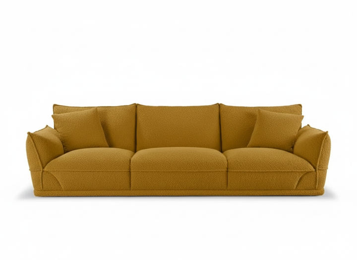 Fabricado con tapicería bouclé de primera calidad en un vibrante amarillo mostaza , este moderno sofá destaca en cualquier hogar contemporáneo. Su amplio respaldo con buen soporte y su tela suave y agradable al tacto garantizan comodidad y durabilidad.