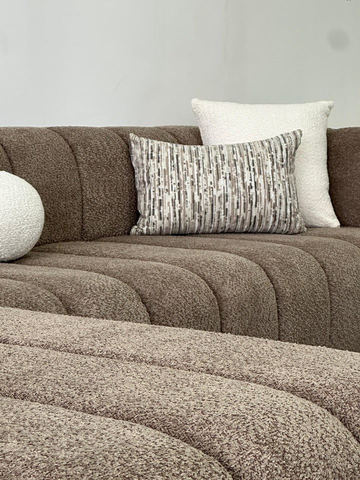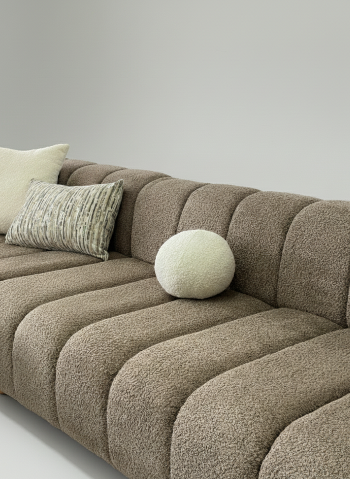 Amplio sofá seccional en forma de L con tapizado de bouclé con mechones y felpa