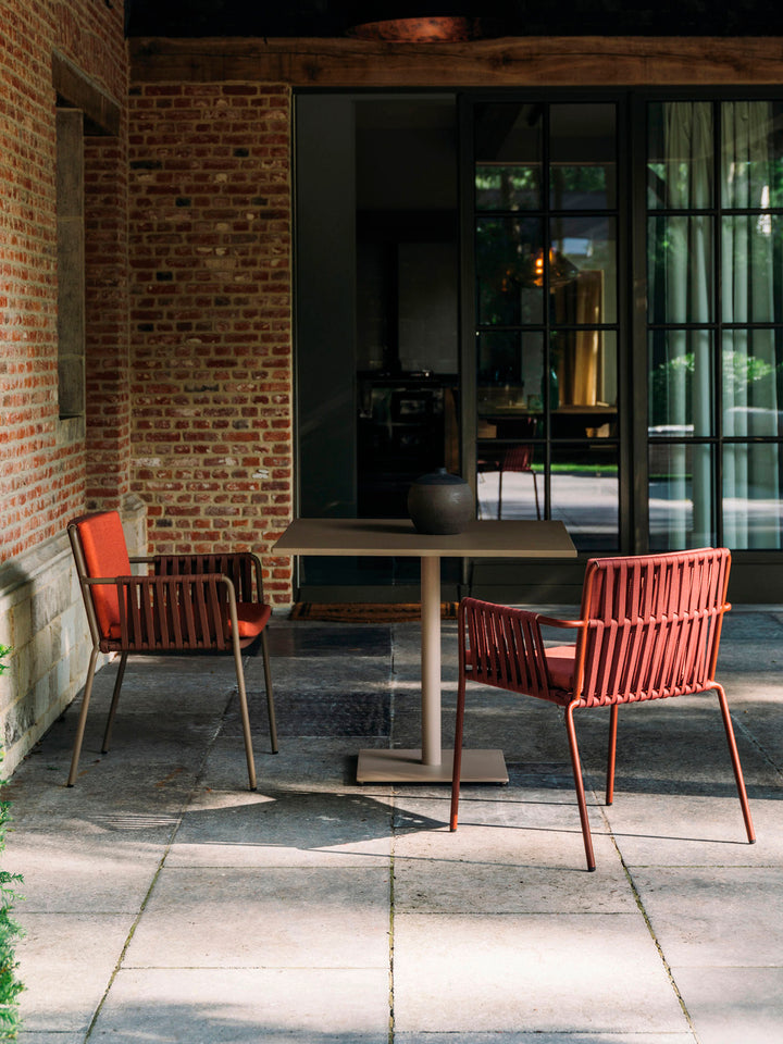 Mejore su experiencia gastronómica al aire libre con la moderna silla de comedor de cuerda para exteriores, una sofisticada solución de asiento diseñada para brindar comodidad y un estilo escultural a patios, terrazas o jardines contemporáneos. Con una estructura de metal con recubrimiento en polvo en un cálido tono terracota, detalles de cuerda tejida a mano y un cómodo cojín de asiento resistente a la intemperie, esta silla combina el minimalismo moderno con la artesanía para convertirse en un elemento destacado en cualquier espacio exterior.