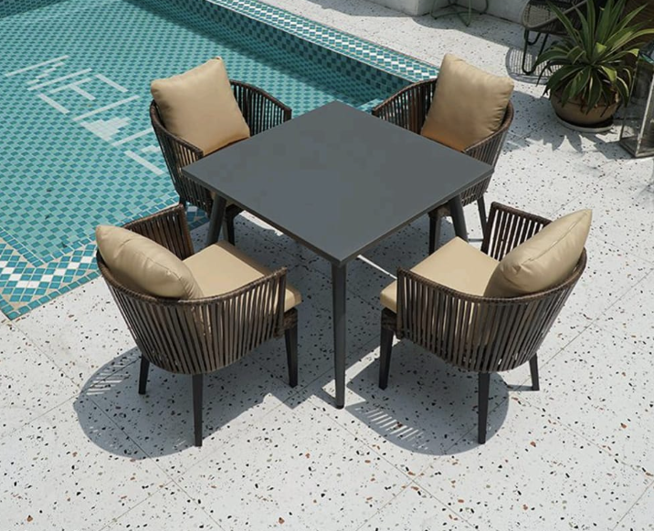Moderno juego de comedor para patio al aire libre: mesa cuadrada con sillones y cojines de cuerda tejida