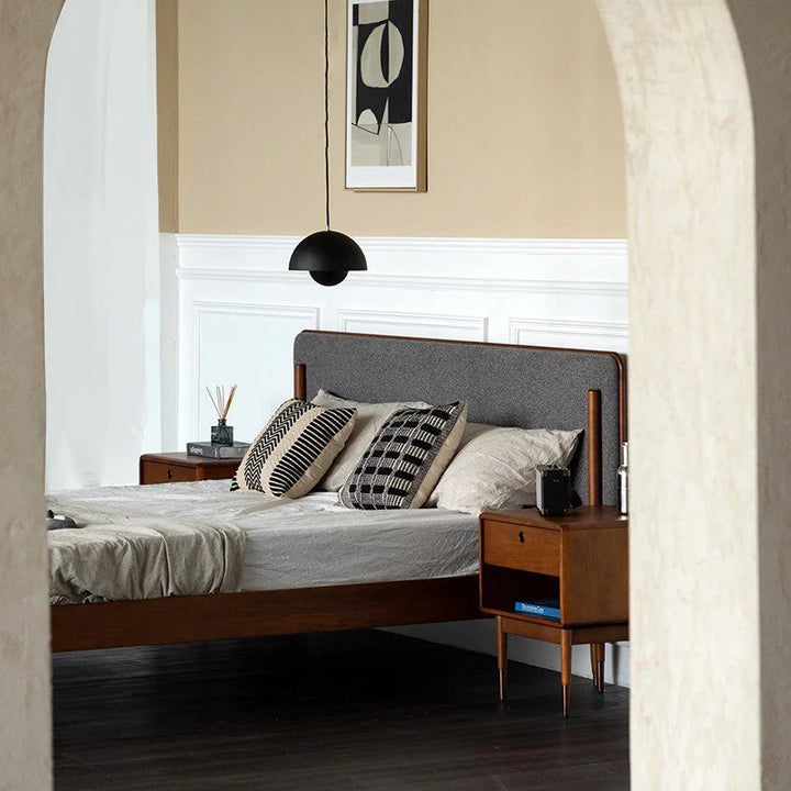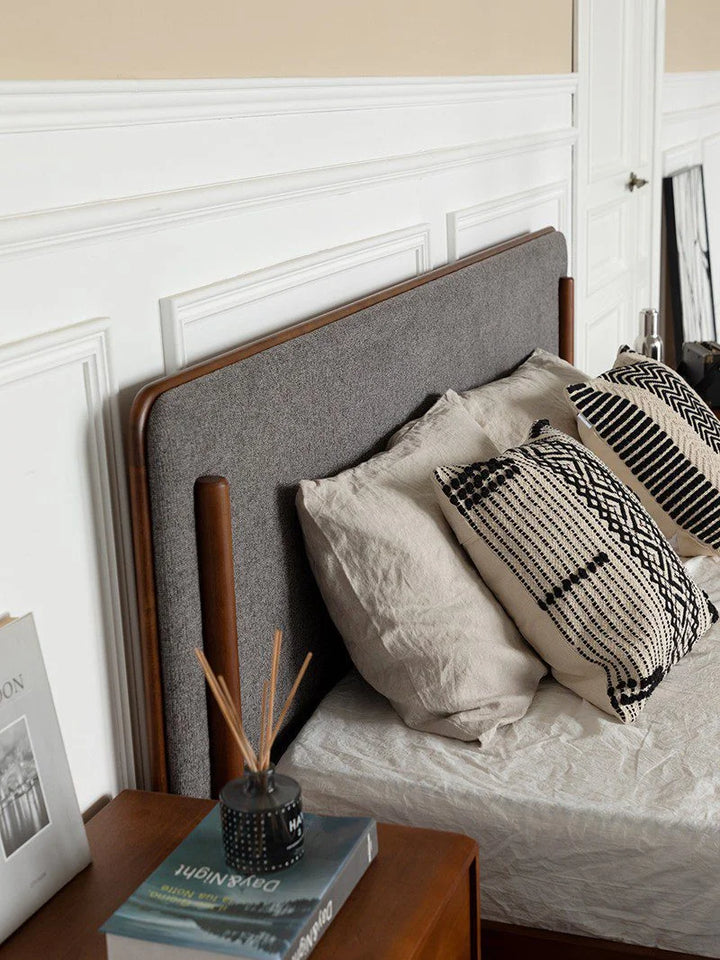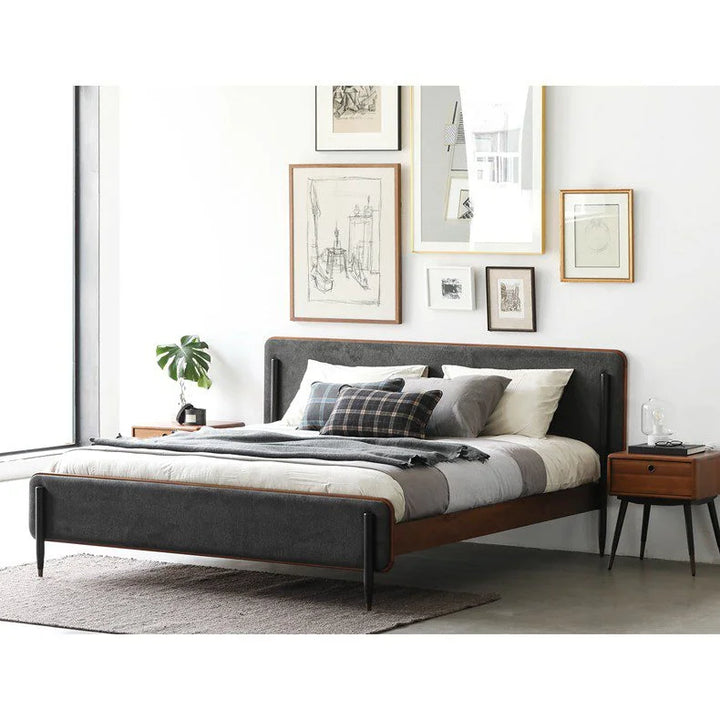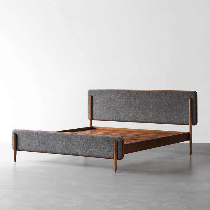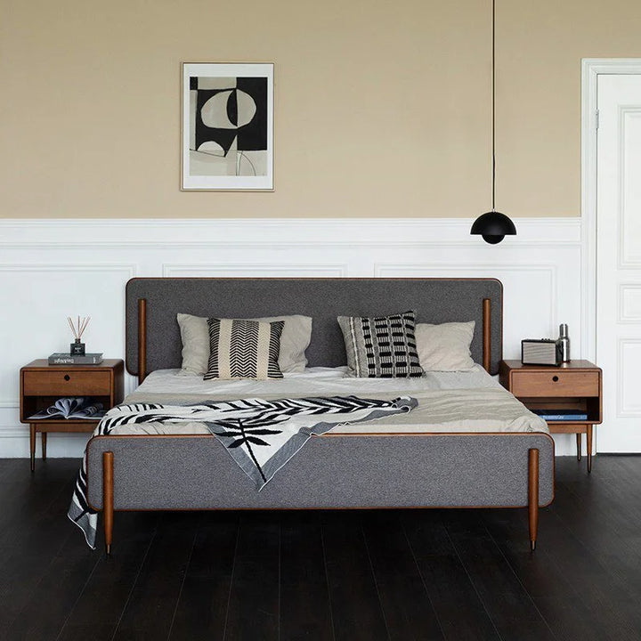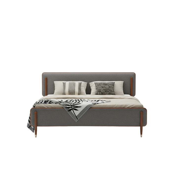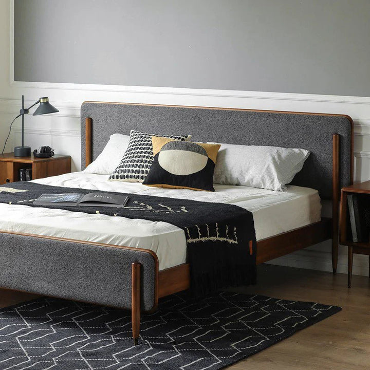 Cama tapizada moderna de mediados de siglo: estructura de madera maciza, tela gris y patas esculpidas.